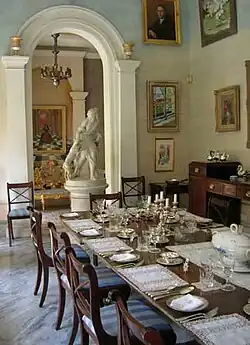 The building saw several modifications over the years with the main design being Palladian architecture. In the early 20th century part of the garden was built, to extend the house, in the Art Deco style.[16]