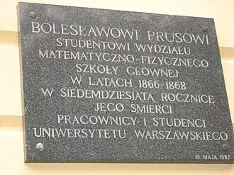 Plaque on Warsaw University's Casimir Palace, commemorating 1866–68 student Bolesław Prus