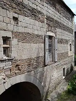 A castle was built on this strategic rock in the 8th century. It was rebuilt in the 11th century. The south wall of the keep was the strongest with the principal vaulted rooms and two square corner towers. A grand staircase was placed to the north in the 18th century. A 15th century entrance gate displays the coat-of-arms of the two families. Also at this time two wings were added conserving the appearance of a fortress. The core of the village was protected by defensive walls which are mainly intact. 44°07′47″N 2°55′57″E / 44.12961°N 2.93252°E / 44.12961; 2.93252[5]
