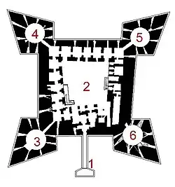 The dimensions of the outer sides of the castle, measured at the base of the frame of the corner bastions, are variable, with the east front, the longest of all, being about 127 meters long, the west front, shorter by three meters, and the south and north ones, both about 120 meters long. The diagonal between the tips of the ramparts measures about 125 meters, within which there are two tiers of superimposed casemates with a diameter of 16 meters.[78] The height of the west front, the tallest one given the presence of the bomb disposal laboratory building, corresponds to about 24 meters while the north front, the shortest, has a maximum height of 19 meters.[79] The walls of the castle vary in thickness from 5 to 12 meters and are built of limestone cut into squared and barely rusticated blocks, much of which was taken from buildings destroyed during the sack of 1528.[78]