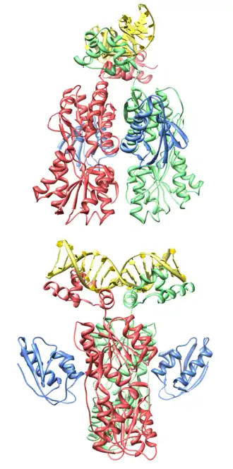 - ^ a b c Schumacher, M. A.; Allen, G. S.; Diel, M.; Seidel, G.; Hillen, W.; Brennan, R. G. (2004). "Structural Basis for Allosteric Control of the Transcription Regulator CcpA by the Phosphoprotein HPr-Ser46-P". Cell. 118 (6): 731–741. doi:10.1016/j.cell.2004.08.027. PMID 15369672. S2CID 8681392.