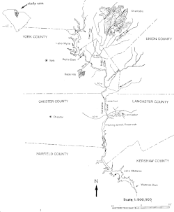 The river flows into northern South Carolina, passing Rock Hill, through Fishing Creek Reservoir near Great Falls, and into the Lake Wateree reservoir, approximately 30 miles (50 km) northeast of Columbia. At the now-submerged confluence with Wateree Creek, it becomes known as the Wateree River.
