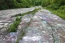 Pennsylvania Route 61 was repaired several times until it was closed. Smoke and steam caused extensive cracking in the pavement, which led to frequent closure. The current route was formerly a detour around the damaged portion during the repairs and became a permanent route in 1993. The damaged portion of Route 61 was abandoned, and became known as Graffiti Highway.[31] Access berms were placed at both ends of the former route, effectively blocking off the area permanently to vehicular traffic. Pedestrian traffic was still possible due to small openings about two feet wide at the northern and southern terminus of the abandoned stretch of road.