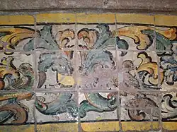 From the 17th–18th centuries, the most flourishing period of ceramic production in Cerreto Sannita and San Lorenzello, numerous artifacts have survived (preserved in the Cerreto Sannita Civic and Ceramic Museum or in the permanent ceramic exhibition curated by the “Giustiniano” Association), along with some examples of floorings. The earliest, chronologically, is likely that of the pronaos of the Monastery of the Poor Clares in Cerreto. The large quadrangular hall features a majolica floor decorated with wind roses and garlands. This decoration is repeated in the flooring of the last chapel on the left in the Collegiate Church of San Martino, likely created by Nicolò Russo and Lorenzo Salandra. Also noteworthy in Cerreto Sannita are the flooring of the penultimate chapel on the left in the collegiate church, created by Domenico Marchitto in 1728, which anticipates the decorative theme used by Nicolò Russo in the flooring of the Church of San Gennaro, particularly in the predella of the main altar, where birds embellish naturalistic motifs. The floorings of the Rosary Chapel in the Church of Sant'Antonio in Cerreto Sannita and the Church of San Giuseppe stand out from traditional decorations, featuring less vibrant colors.[5]