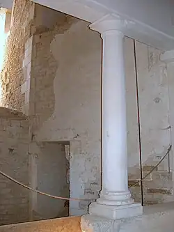 The extant entrance hallway was built in the center of the gallery and was centerpiece of the commons. The plans of Du Cerceau shows a floored gallery with five arches leading to an open-air fixed bridge supported by four columns and a moveable gateway. From the bridge over the moat was then the north tower of the pentagonal house.