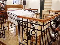 A square bimah with two entrances is located in the middle of the room, also rounded by a balustrade. Formerly, a 180-kilogram (400 lb) menorah with the Polish Eagle on the top was located in synagogue. It was given to the yeshiva by the Jewish kehilla from Przemyśl.[2]