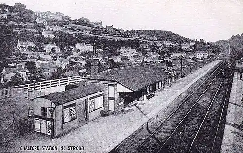 The Great Western Railway (GWR) line between Kemble and Gloucester – which had been planned by the Cheltenham and Great Western Union Railway – had opened on 12 May 1845, but no station was originally provided at Chalford: to the south-east was Tetbury Road, and to the west Brimscombe.[1] On 2 August 1897, a new station was opened at Chalford.[2]