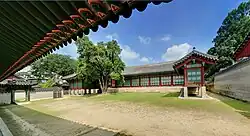 A large gate that leads into the naejŏn. It was named in 1475.[81] Its right and left annexes were destroyed in the Imjin War, and rebuilt in 1647.[22] It was destroyed during the colonial period and reconstructed in 1996.[81] |