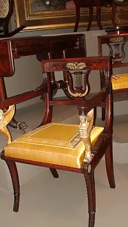 As the Empire style became more entrenched and his success grew, Lannuier produced larger, more expensive pieces, including sofas, cylinder desks and bedsteads. While his pieces are considered within the Empire style, Lannuier's work is distinct for being more delicate and for recalling the refinement found in the Directoire style. Examples of Lannuier's furniture can be seen in the White House Red Room, the Albany Institute of History and Art,[4] the Museum of Fine Arts, Boston, and New York's Metropolitan Museum of Art and Bartow-Pell Mansion.
