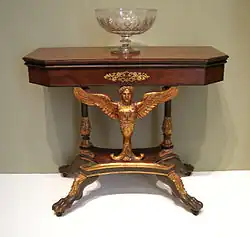 Lannuier's furniture is characterized by its use of architectural motifs–-columns, brackets, pediments, and pilasters; Greek and Roman motifs including anthemions, lyres, caryatids, dolphins, laurel wreaths, and winged figures. Federal motifs associated with the early Republic include eagles and five- or six-pointed stars. Large figures were carved and gilded, while smaller decorative mounts were cast in bronze and gilded.