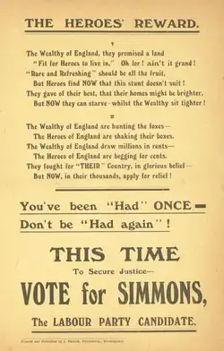 After that war, Simmons became a leading member of the National Union of Ex-Servicemen (NUX), a socialist group which fought for the rights of those returning from the war.[5] Following the demise of the NUX as a national body, Simmons remained active on these issues in local organisations and when later elected to Parliament lobbied persistently on behalf of the British Limbless Ex-Servicemen's Association (BLESMA).[6] A Christian Socialist, he also played a leading role in the Labour Church movement.[7]