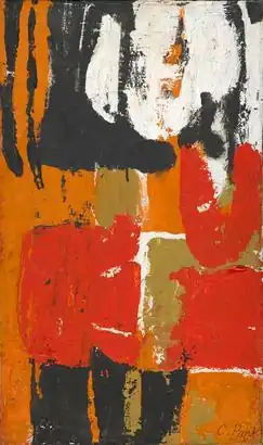 In 1949, Park began teaching at Leonard School for Girls; she later became an instructor at the Dalton School. Between 1955 and 1957, she taught at the People's Art Center of the Museum of Modern Art.[1][9]: 6 [note 5][note 6] In 1952, she participated in a group show at the Peridot Gallery; the following year she had a painting in the Annual Exhibition of Contemporary American Painting at the Whitney Museum of American Art.[9]: 6 [16][note 7] In 1954, she participated in a group show at the Guild Hall in East Hampton.[19] The Tanager Gallery in Manhattan presented her first solo show in 1957.[20] Park showed often during the later 1950s, particularly in group exhibitions at Eleanor Ward's Stable Gallery.[3][note 8]