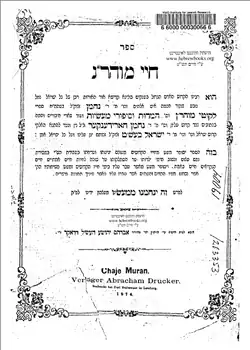 Chayey Moharan (Hebrew: חיי מוהר"ן) is the biography of Rabbi Nachman of Breslov, written by his disciple and scribe Rabbi Nathan of Breslov. As the tzaddik is of central importance in Judaism and especially Breslov, and as the book is about Rabbi Nachman's life and Rabbi Nachman and his followers held himself to be the tzaddik hador (tzaddik of the era), Chayey Moharan is an extremely important Jewish book. It became more widely known to Anglophones with the publication of its translation, titled Tzaddik, by Breslov Research Institute, in 1987. MOHaRaN is acrostic for Moreinu V'Rabeinu Harav Rabbi Nachman meaning "Our Master and Teacher, Rabbi Nachman."