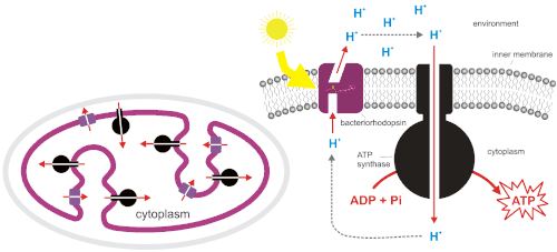 Chemiosmotic coupling between the energy of sunlight, bacteriorhodopsin and phosphorylation (chemical energy) during photosynthesis in the halophilic archaeal organism Halobacterium salinarum (syn. H. halobium). The archaeal cell wall is omitted. [6][7]
