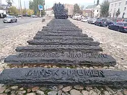The first part of the march passed through the streets of the burning city.[17][28][29] The evacuees were then ordered to abandon their luggage.[30] Some prisoners, especially those living in Minsk, attempted to escape in the chaos. However, in most cases, they were killed by the guards' bullets.[29][31] Some attempted to blend in with the crowd of refugees and fire victims. The escort then ruthlessly opened fire, killing both the escapees and civilians who got too close to the column. There were also cases of prisoners dying under the rubble of collapsing buildings.[28]