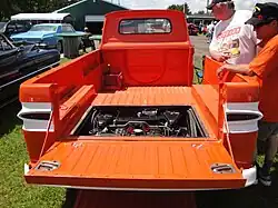 A Corvair 95 truck was available as a "Loadside" or "Rampside". The Loadside was a pickup truck with a standard tailgate for accessing the cargo bed from the rear over the engine compartment. The bed included a metal panel that could be unscrewed to access the engine for major service. The cargo bay area between the engine compartment and the rear of the cab could be covered with a deck to form a level surface with the top of the engine compartment.[5] The Loadside was produced during two model years with 2,844 made in 1961 and 369 built in 1962. The Rampside had a ramp hinged at the bottom of the cargo bay area on the right side of the vehicle.[6] Rubber trim on the edge helped avoid scratching the paint when the ramp was lowered for loading and unloading cargo.[6] These were used by the Bell Telephone Company because loading and unloading of cable drums was eased by the side ramp.