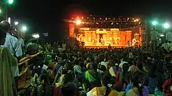 The festivals in Chidambaram are centred on the festivals of the temple. The Marghazhi Thiruvaadhirai festival celebrated in December–January indicates the first puja, the fourteenth day after the new moon (Chaturdashi) of the month of Masi (February–March) indicates the second pooja, the Chittirai Thiruvonam (in April–May), indicates the third pooja or uchikalam, the Uthiram of Aani (June–July) also called the Aani Thirumanjanam indicates the evening or the fourth puja, the chaturdasi of Aavani (August–September) indicates the fifth puja and the chaturdasi of the month of Puratasi (October–November) indicates the sixth pooja or Arthajama. Of these, the Marghazhi Thiruvaadhirai (in December–January) and the Aani Thirumanjanam (in June–July) are the most important festivals. During these festivals, the festive deity is brought outside the sanctum sanctorum in a procession that includes a temple car procession followed by a long anointing ceremony.[38] Several hundreds of thousands of people flock the temple to see the anointing ceremony and the ritualistic dance of Shiva when he is taken back to the sanctum sanctorum. Shiva, in his incarnation of Nataraja, is believed to have been born on full moon day in the constellation of Ardra, the sixth lunar mansion. Lord Shiva is bathed only 6 times a year, and on the previous night of Ardra, the bath rituals are performed on a grand scale. Pots full of milk, pomegranate juices, coconut water, ghee, oil, sandal paste, curds, holy ashes, and other liquids and solids, considered as a sacred offering to the deity are used for the sacred ablution.[11]