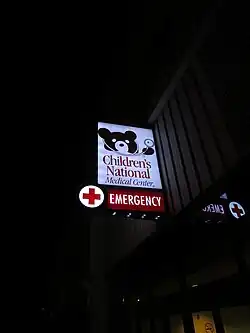 Children's National Hospital (formerly Children's National Health System,[1] DC Children's Hospital, Children's National Medical Center) is a freestanding, 323-bed, pediatric acute care children's hospital located in Washington, D.C. It is affiliated with the George Washington University School of Medicine and the Howard University College of Medicine.[2] The hospital provides comprehensive pediatric specialties and subspecialties to infants, children, teens, and young adults aged 0–21 throughout the region.[3][4] The hospital features an ACS verified level I pediatric trauma center, the only one in the District of Columbia.[5] Its pediatric intensive care unit and neonatal intensive care units serve the region. The hospital also has a rooftop helipad for critical pediatric transport.[6]