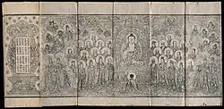 Regarding physical aspects, while the Kaibao canon came in scrolls made from several sheets of paper pasted together, later editions were packaged in different styles such as accordion folding books and the string binding style initiated by the Jiaxing canon (also called "Indian style" since it imitated Indian manuscripts).[4] Texts were also preceded or closed by prefaces and colophons that contained information such as titles, text origin, printing date, sponsors, and even the names of printers and binders.[4] Some editions also included illustrations of various scenes, such as Buddha assemblies from specific sutras and landscapes.[4] Various types of paper were used for the canons, many of them being made from mulberry and hemp, while woodblocks were made from pear wood or jujube wood.[4]