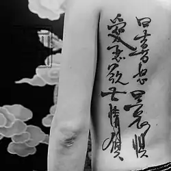 Chinese character tattoos, also called Hanzi tattoos, are tattoos of Chinese characters. They are sometimes in Chinese calligraphic script, a stylized, artistic form of writing.[1]