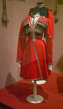 A chokha,[a] also known as a cherkeska,[2] is a woolen coat with a high neck that is part of the traditional male dress of peoples of the Caucasus.[3] It was in wide use among Avars, Eastern Armenians,[4] Abazins, Abkhazians, Azerbaijanis, Balkars, Chechens, Circassians, Georgians, Ingush, Karachays, Kumyks, Nogais, Ossetians, Tats, the peoples of Dagestan, as well as Terek and Kuban Cossacks from the Russian Empire, who adopted it from the aforementioned peoples.[4]