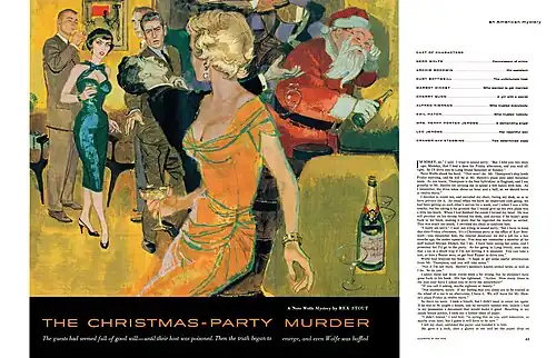 "Christmas Party" is a Nero Wolfe mystery novella by Rex Stout, first published as "The Christmas-Party Murder" in the January 4, 1957, issue of Collier's magazine. It first appeared in book form in the short-story collection And Four to Go, published by the Viking Press in 1958. The story has been adapted for television, radio, and the stage.