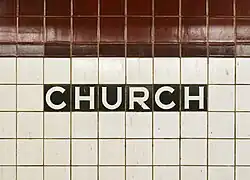 This underground station, located in Kensington,[32] has four tracks and two island platforms.[33] Both outer track walls have a maroon trim line with a Tuscan red border and small tile captions below them reading "CHURCH" in white lettering on a black background. This tile band is set in a two-tile-high course, an arrangement normally seen at local stations.[34] The tiles were part of a color-coded tile system used throughout the IND.[35] The tile colors were designed to facilitate navigation for travelers going away from Lower Manhattan. Because Church Avenue was an express station, it uses a different tile color from the next station to the north, Fort Hamilton Parkway.[36][37] All I-beam columns in the station are colored Hunter green. The station signs are in the standard black name plates with white lettering.[38]