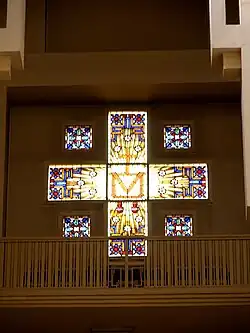 The feature that stands out in the church is the large geometric tower that narrows as it ascends on the main façade. A sculpture of Christ is above the tower. The use of sculpture in the architecture of Víctor Eusa is common, but, as in this case, they are not human figures with human postures, rather figures of static men or women, geometric like the building itself.[2]