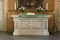 The church has an iconostasis, a feature of Eastern Orthodox churches that stands before the sanctuary. It was made by some of the best icon-painters in Moscow.[4] A preexisting wall in the church was used for this purpose, but it first needed to be prepared for painting through reintroducing plaster in some areas and removing paint from plaster in others. Because of the church's new ties to Russia, these renovation efforts needed to be supervised by a conservator of monuments from St. Petersburg, who participated in video-conferences at certain junctures.[5] Among other saints, it includes three Germans who were canonized by the Russian Orthodox Church.[4] The paintings were made with pastel pinks, oranges and greens as well as shining gold and other colors.[8] The fresco painting techniques that the icon-painters used to convert the previously existing wall into an iconostasis make this work unique in Europe.[5]