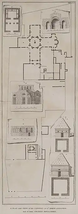 Long abandoned and ruined, the site is part of the series of ruins referred as the Dead Cities of Syria. Until just recently, remains of the pillar of Saint Simeon still stood, despite having been whittled down to a block only a few meters tall from years of pilgrims cutting down small parts for themselves as relics; substantial surviving parts of the column shaft were last visible in the 17th century.[5][6] The dome above it apparently survived until the 19th century.[6]