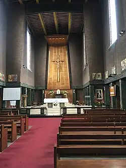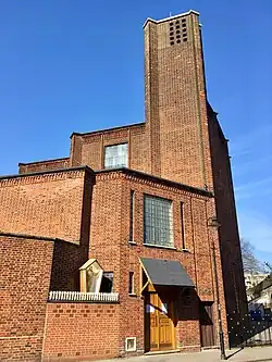 The church was built between 1952 and 1958 in the Moderne style and has been listed Grade II on the National Heritage List for England since 2015.[1] The foundation stone of the present church had been laid by Cyril Cowderoy on 19 April 1952.[3]