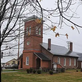 Churchville Presbyterian Church is a historic Presbyterian church located at Churchville, Harford County, Maryland. It consists of three harmoniously designed sections: the original one-story, four by three bay, gable-roofed brick building dated to 1820; the three-story, restrained Italianate, brick bell tower added in 1870; and the low, one-story brick church hall and office added in 1950. Located adjacent is a sequestered 4.5-acre (1.8 ha) graveyard with stones dating back to 1819. The community of Churchville, which surrounds the church, grew up around and took its name from the structure.[2]