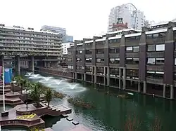 ![]() The School, seen on the right, facing the waterway and fountains of the Barbican Centre | |