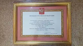 Vyborg was conferred the status of "City of Military Glory" by President Medvedev on March 25, 2010, for "courage, endurance and mass heroism, exhibited by defenders of the city in the struggle for the freedom and independence of the Motherland".[52] A ceremony was held in the Moscow Kremlin on 4 May 2010 at which the city was represented by the Head of the Administration of Vyborgsky District Konstantin Patrayev.[25][53]