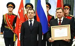 Volokolamsk was conferred the status of "City of Military Glory" by President Medvedev on March 25, 2010, for "courage, endurance and mass heroism, exhibited by defenders of the city in the struggle for the freedom and independence of the Motherland".[46] A ceremony was held in the Moscow Kremlin on May 4, 2010 at which the city was represented by Head of Volokolamsky District, Vyacheslav Karabanov, and Pavel Osipov, a veteran from World War II. At the ceremony Dmitry Anatolyevich Medvedev said that the exploits of the Panfilovtsy “became a true symbol of courage and selflessness”.[25][47]