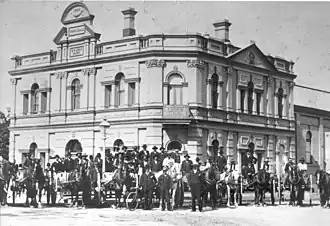 On 28 February 1871, Frederick Keene was appointed the first Clerk.[8] Thomas Willmot was appointed Clerk on 13 August 1872.[9] Thomas Leeder was appointed Clerk on 7 August 1877.[10] Percival Somerville was appointed Clerk on 23 March 1905.[11][12] On 17 December 1886, West Botany Ward was split in two, adding Rockdale Ward and Scarborough Ward and bringing the number of Aldermen from six to nine.[13] Among the main developers during this period was Frederick Jamison Gibbes, a member of parliament whose name is perpetuated by Gibbes Street in Banksia.[14][15] From 1872, Council met in the first Council Chambers, a small purpose-built stone building on the western side of Rocky Point Road, Arncliffe built by Christopher Bush of St Peters. It continued in use until 11 December 1888, when a new Town Hall was opened by the mayor, William George Judd, on the corner of Rocky Point Road and Bryant Street, Rockdale.[16] The old Council Chambers building was eventually sold in 1904.[17]