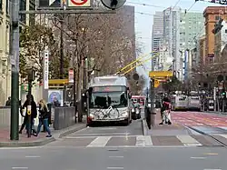 Two Muni heritage streetcar stops are located above the station: Market and 7th Street, and Market and 8th Street (inbound) / Market and Hyde (outbound). Both are served by the F Market and Wharves line. The station is also served by a number of Muni bus and trolleybus routes:[25]