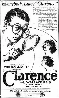 Clarence is a 1922 American silent comedy drama, based on the 1919 play by Booth Tarkington, produced by Famous Players–Lasky and distributed through Paramount Pictures. It was directed by William C. deMille and starred Wallace Reid in his penultimate screen appearance.[1]