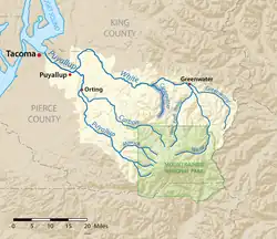 The Clearwater River is shown highlighted in the Puyallup River watershed