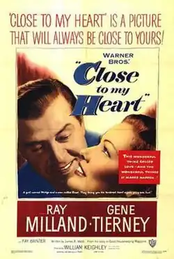 Close to My Heart is a 1951 American drama film directed by William Keighley, written by James R. Webb (based on his novel A Baby for Midge), and starring Ray Milland and Gene Tierney.[1][2]