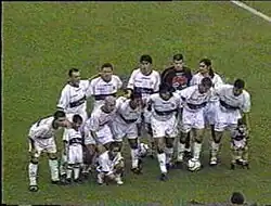 From 1994 to 1999, Olimpia would produce the debut of several youth team graduates and future national team players, such as Richart Baez (1993),[5] Denis Caniza (1994),[6] Carlos Humberto Paredes (1996),[7] Roque Santa Cruz (1997),[8] Ruben Maldonado (1997)[9] and Julio César Caceres (1999).[10] Baez was transferred to J1 League club Avispa Fukuoka whilst Santa Cruz, Paredes, Maldonado and Caceres were transferred to UEFA clubs. Five of the six players went on to play at FIFA World Cup tournaments for Paraguay. Olimpia also had won league titles in 1993 and 1995 and then four back-to-back titles from 1997 to 2000.