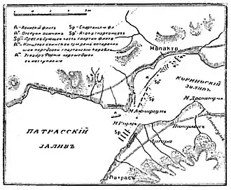 At the same time as the battle at Stratus, the fleet that was supposed to support Cnemus was drawn into battle at Naupactus by the Athenian admiral Phormio.[8] Not having expected to engage in a sea battle, the Spartan fleet consisted primarily of ships suited only for transporting troops rather than for fighting.[8] This, along with the fact that Phormio's men were more experienced in naval warfare than the Spartans, gave Phormio the confidence to attack the Spartans’ forty-seven ships with his twenty.[9] Taking advantage of the Spartan fleet's inexperience, Phormio developed a strategy to create confusion among the Spartan ships and was thus able to rout their forces, capturing twelve enemy ships by the end of the battle.[10] The surviving Spartan ships sailed to Cyllene, where they regrouped with Cnemus.[10]