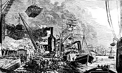 Shipping coal at Newcastle c. 1878. Steam-cranes are lifting the removable hoppers from the rail wagons.[44] The building in the left background is the newly completed Newcastle Customs House.