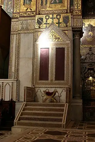 Monreale Cathedral, royal throne. In the mosaic above the throne one notices, at a larger scale, two coats of arms with the bend chequy and, at a smaller scale, two coats of arms with the octagonal star.