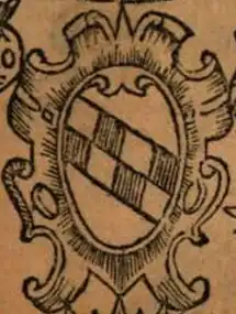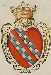 The coat of arms is traced back to Roger II, who is said to have adopted it at his coronation as King of Sicily.[1] The Norman "bore as his insignia a duplicate bend, divided into five parts, that is, five red, and five silver, which descends from the right side to the left side crosswise, set in an azure field [...]: which according to the terms of the Blazon of arms [. ...], as composed of two principal colors, and of silver metal, signify nothing else, than an invincible spirit in acquiring supremacy; those insignia carved in stone were seen the years before in Naples above the third door of the Castel dell'Ovo [...]"[2].