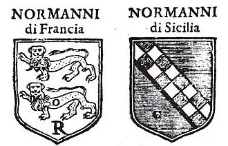 The question of the multiple attributions of insignia to the Siculo-Norman dynasty and the discordant positions taken by the various authors who have dealt with the Hauteville coat of arms is addressed by the Norman genealogist and heraldist Gilles-André de la Rocque.[36] In particular, in addition to the coat of arms with the bend chequy (in the red variant with silver and azure tiles, i.e., the coat of arms emblazoned by Favyn, which, in this regard, de la Rocque cites as a reference), the Norman author notes no less than four other insignia that different sources attribute "à la Maison d'Hauteville ou de Sicile-Antioche."[37]