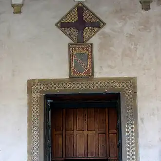 Finally, an interesting variant of the Hauteville insignia is reproduced inside the Holy Trinity Complex in Venosa. The coat of arms is included in a pictorial decoration, datable to the 16th century, made on the top of the arcosolium of the Hauteville tomb, a funerary ark, where William Iron Arm, Drogo of Hauteville, Humphrey of Hauteville and Robert Guiscard are buried. The coat of arms, trimmed in gold and gules, on a bend chequy with two azure and silver tiles, is held by two putti, which in turn are flanked by two shields with the Maltese cross of the Knights Hospitaller.[24]