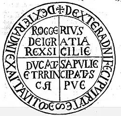 The same motto was later adopted by Roger II, probably starting in 1136, in Latin documents.[48] In a table accompanying the Dissertazioni sopra le antichità italiane by the presbyter and historian Ludovico Antonio Muratori, it is possible to observe a reproduction of Roger II's signum, which bears, in the legend circumscribing it, precisely the motto in question.[49]