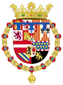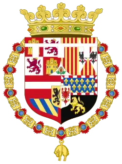 The whole is differenced by a label of three points Azure, the difference used by heirs apparent to the Spanish House of Habsburg.