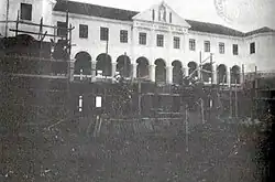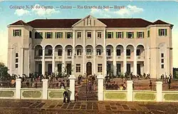 In 1922, the parish ordered the brothers to vacate the premises and build a new school elsewhere. Construction work started in 1924, under the direction of Brother Mauricio. Land was bought in front of the previous premises, and construction was organized by the Brother Mauricio and a special commission that had Canon Meneguzzi and the municipal intendant Celeste Gobbato as honorary presidents. Funding came from loans and donations from the community, including committee members. The school started partial operation in 1928, and was fully operational by the end of 1929.[2] It was originally named Instituto Nossa Senhora do Carmo. The new headquarters were designed by Joseph Lutzenberger and executed by Silvio Toigo, who later built the side wings in the same style.[4] The press reported the school's opening, praising its teaching and the architecture of the building.[5]